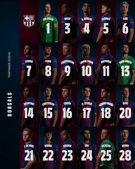 Բարսելոնան հրապարակել է 2025-26 մրցաշրջանի համար նախատեսված խաղացողների պաշտոնական կազմը։